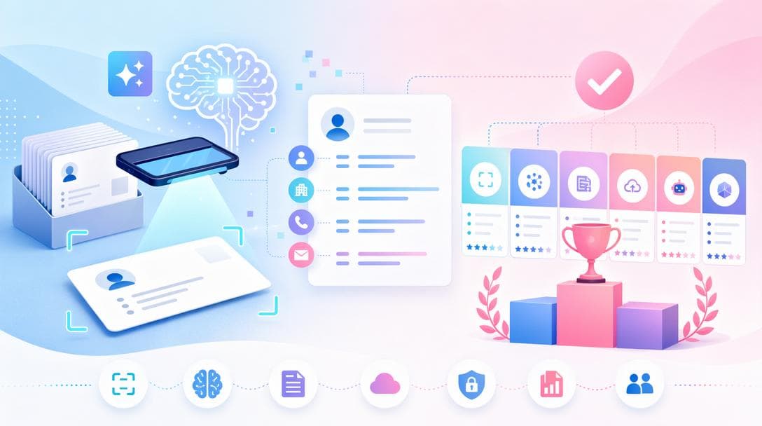 2026年最新のAI名刺管理ツール7選を無料枠・OCR精度・セキュリティなど10項目で徹底比較。個人〜大企業まで用途別おすすめと導入手順、電帳法対応まで網羅的に解説します。